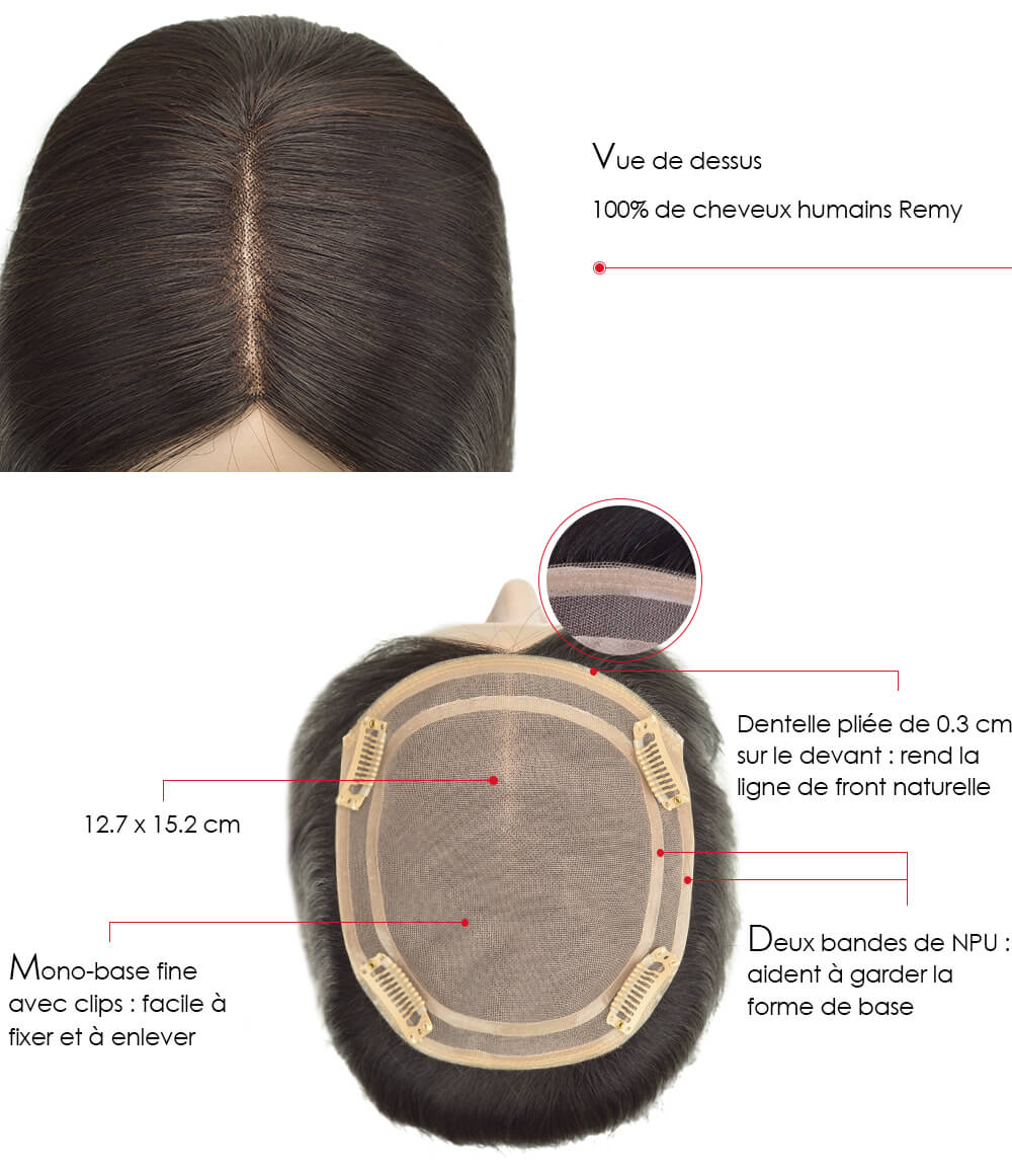 Ce mono topper pour femme est composé de cheveux humains Remy mongoliens naturellement raides. Il est de densité moyenne, ce qui permet de répondre à vos besoins en matière de quantité de cheveux. Livraison immédiate.